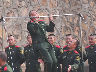 12月18日,武警湖北总队武汉市支队新训大队入伍仅3个月的新兵梁世安(右),与班长赵文龙(左)正在PK器械训练。(图1)