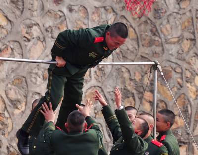 12月18日,武警湖北总队武汉市支队新训大队入伍仅3个月的新兵吴嘉良,在众多战友的保护下,进行器械训练。(图3)