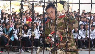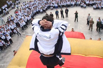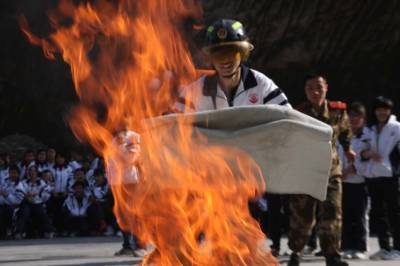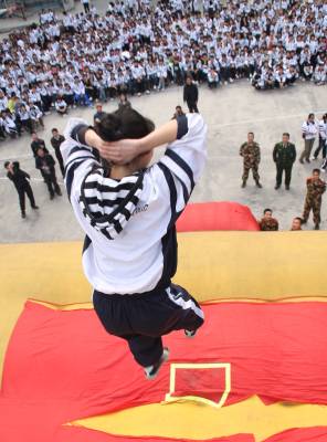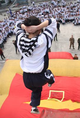 3月26日,一名高中学生在进行举高消防车逃生演练。当日,为迎接”3.29”全国中小学生安全教育日的到来,恩施市消防大队与恩施市第一中学联合开展以”珍惜生命,爱护生命”为主题的消防安全演练,演练现场进行了装备器材展示、火灾帐篷模拟训练、举高消防车逃生等活动。