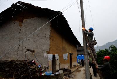 12月19日下午,湖北省秭归县电力公司员工在泄滩乡牛口村四组受灾现场架设临时低压照明路灯。