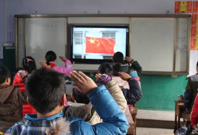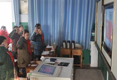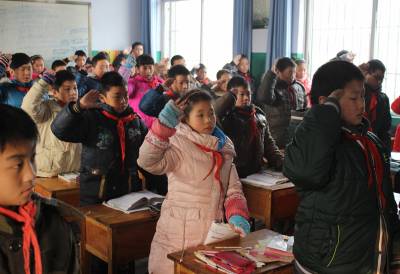 12月23日,湖北省襄阳市襄州区双沟镇第二小学学生在教室内参加升旗仪式。进入冬季,该校针对雾霾、严寒等恶劣天气,启动应急预案,因地制宜开展各项室内活动,让学生在关爱中温暖、健康过冬。(周学明 钟艳华 摄)