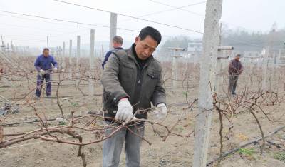 被确定为湖北省新农村建设试点镇的麻城市龟山镇,积极发展特色农业,提高农民生活水平。目前,该镇已发展茶叶、蔬菜、板栗等特色产业18.6万亩。图为石陂村农民在为葡萄修枝。本报视界网 宋杰、江红 摄