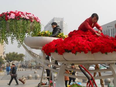 12月23日中午,园艺工作者在武汉市发展大道与汉口火车站广场交汇路口,蹬站在花坛上种花。与以往不同的是今年这次摆放的都是精制的绒绸布仿真花,有月季、小葵花、大红叶等数百朵鲜花,让人看得眼花瞭乱,以假当真。 因受冬季低温天气气候的影响,鲜花在冬天开放时间短就凋谢了,而仿真花开放时间长且可洗涤,花开不败,正喜迎圣诞和元旦新年的到来。