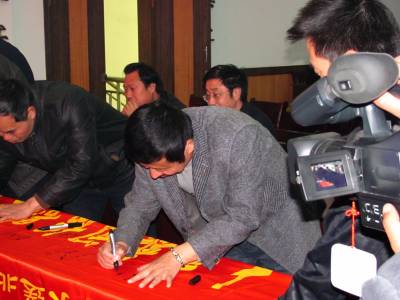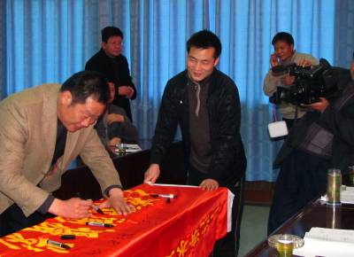 3月26日,郧县南水北调中线工程移民指挥部举行移民新闻摄影采风团授旗签字仪式,为该县的摄影家协会授旗并签字。为围绕服务县委政府的移民工作,郧县摄影家协会将对移民村开展摄影创作活动,以移民生活,库区记忆,历史记录为创作内容。今年郧县将有66个村7176户30264人迁往外地3市14个移民新村。(视界网签约摄影师曹忠宏摄影报道电话13294212877)