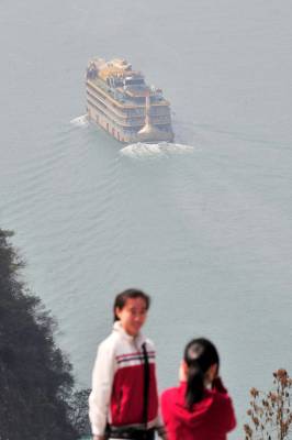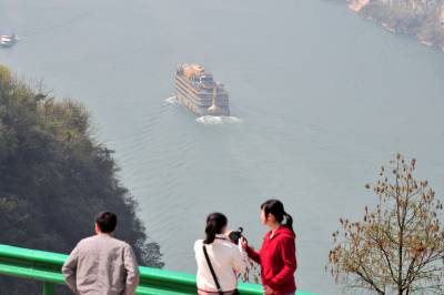 2010年3月27日,长江三峡湖北宜昌西陵峡段,一艘客船行驶在宜昌市夷陵区乐天溪镇王家坪段的江面,游客在江岸拍照留影。连日来,长江上游来水偏少,但三峡深水航道仍没改变,船舶昼夜畅行,长江上游出现罕见枯水位对三峡通航未造成影响。本报视界网张国荣摄