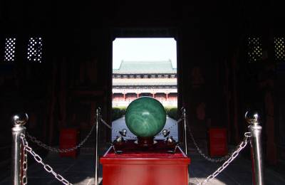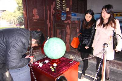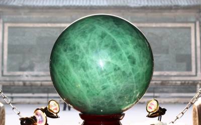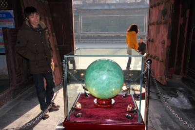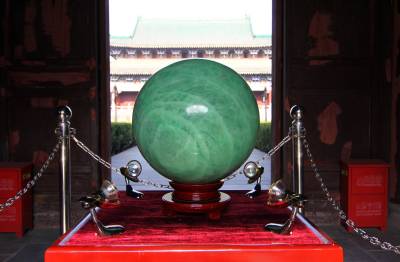 2013年12月29日,湖北省襄阳市,一颗直径36厘米、重达200斤的夜明珠亮相明襄王府。 这颗流失五百多年的夜明珠以仿制的形式回归襄王府,它由绿白相间的莹石制成,能量稳定柔和,在黑暗中能自然发出由绿变白的荧光。