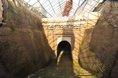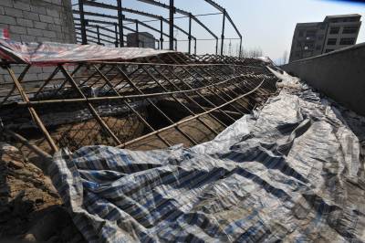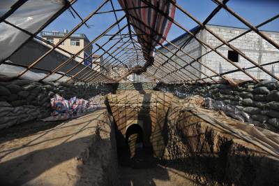 12月29日拍摄的湖北谷城县肖家营仿木砖雕壁画墓的券顶朱绘壁画现状,搭建的保护棚在寒风中四零八落。墓葬保护成为空谈。