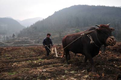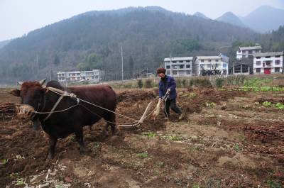 12月24日,在湖北省恩施市板桥镇大木村,八旬老翁李大爷正赶着耕牛为村民翻土备播。