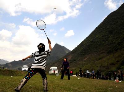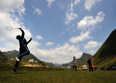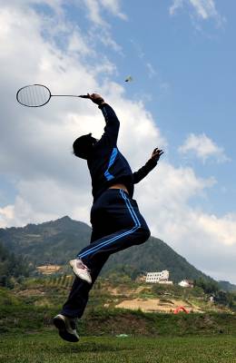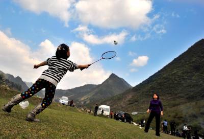 3月27日,宣恩县城区居民在椒园镇洗草坝村蓝天白云下的草地上打羽毛球。将健身娱乐场地从室内搬到室外,从健身房搬进大自然成为居民的一种时常,是全民健身运动的一种新的表现形式,更是民众对健康生活的追求和向往。(视界网签约摄影师:宋文摄)