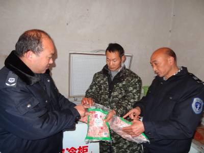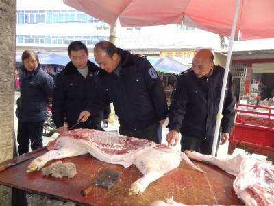 12月31号,金果坪乡动物卫生监督检疫执法人员正在集镇一猪肉摊点进行肉质量安全检查。