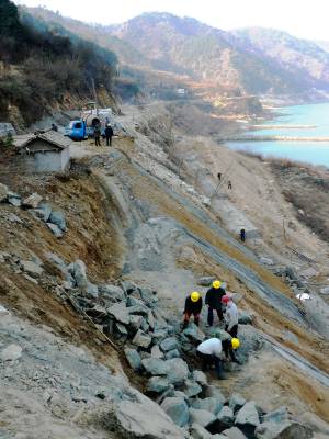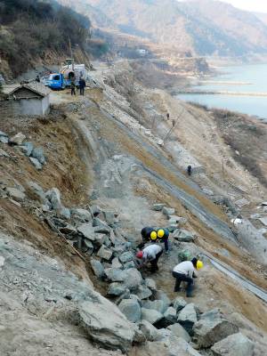 1月1日,农民工顶着彻骨的寒冷在环太极湖生态旅游线路——郧县“柳五”公路五峰乡小石沟村路段忙着砌筑路边驳岸。当日,在“柳五”公路整修全线有10多台机械和百余农民工紧张施工,为加快工程进度出力流汗。 据悉,“柳五”公路柳五公路起点位于柳陂镇白鹤观,终点位于五峰乡集镇,路线全长42.7公里。二级公路标准,柳陂至辽瓦设计路基宽度11米,时速为60公里/小时,辽瓦至五峰路设计宽度9.5米,时速为40公里/小时,项目预算总投资5.6亿元。(本报视界网周宗华摄) 作者地址:郧县五峰乡政府