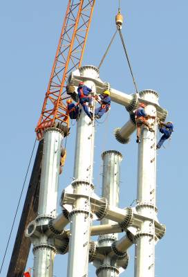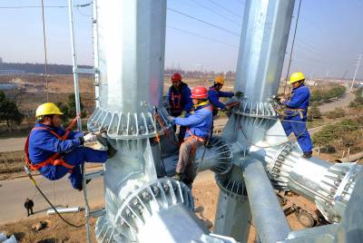 2014年1月1日,在武汉舵落口65米高空的处,湖北省送变电工程公司施工人员吊装220千伏柏泉至李家墩54号铁塔,加紧施工城市电网工程建设。 元旦假日,湖北许多产业工人依然坚守在建设工地上,许多作业人员在高空岗位上度过假期。