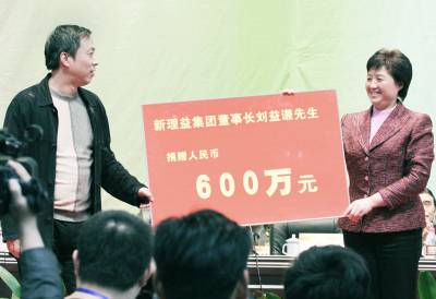 昨(28)日上午,在荆门市举办的迎省运倒计时200天动员誓师大会上,荆门新理益集团董事长刘益谦(左)代表个人向省十三运会荆门组委会捐赠人民币600万元。当天,共有7位企业家现场向省十三运会荆门组委会捐款1200万元和价值260万元的物资。(本报视界网宁新生摄)