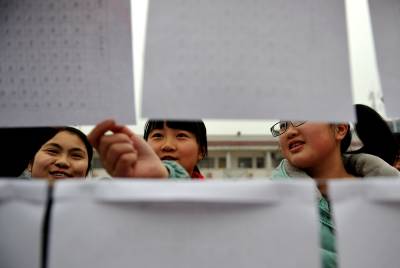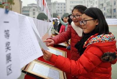 1月2日,宣恩县民族实验中学八年级学生正在欣赏硬笔书法作品。为喜迎新年到来,丰富师生文化生活,增强学生对汉字书写艺术、祖国传统文化的热爱之情,该校举办了此次硬笔书法作品展,共展出师生硬笔书法作品700余幅,吸引3000多名师生、家长和社会人士参观。 视界网 李以国 摄(13997771030)
