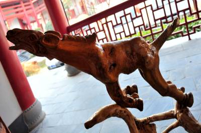 李在禄今年61岁。他的“十二生肖”根雕作品花费时间3年之多。期间他一有空闲就上山寻找合适的根材、琢磨造型。年前,李在禄为最后一件作品“奔马”上漆,完成了根雕版“十二生肖”的全部创作。
