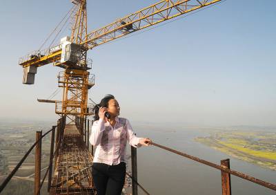 高空女塔吊工27日,姜达芬正在240多米高的黄石市鄂东大桥塔顶与地面通话。今年35岁的她是来自四川省达州市渠县的农民女工,2008年她通过考试获得了塔吊资格证,去年便跟随爱人一起到黄石鄂东大桥打工,成为鄂东大桥240多米高塔吊的操作工,用她的双手为建设鄂东大桥做出了贡献。据了解,她是240多米高塔吊惟一的女操作工。黄石市黄石日报摄影部邱孝威摄电话:13807232603邮编:435002