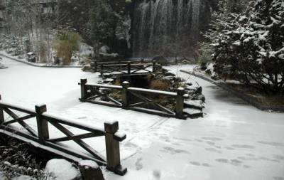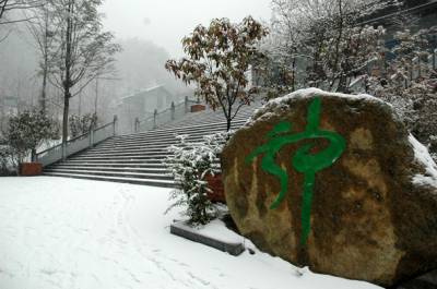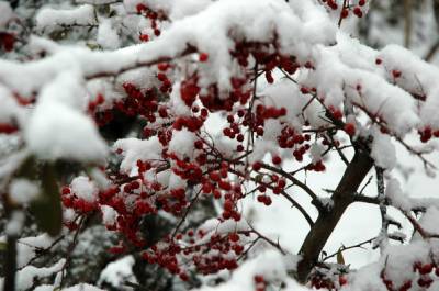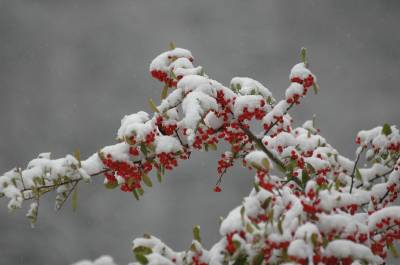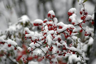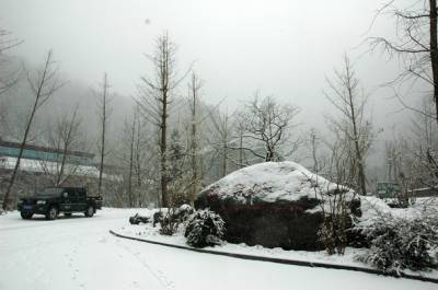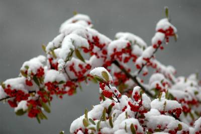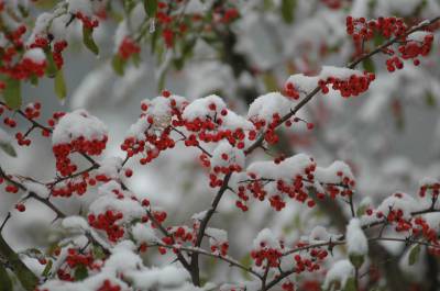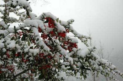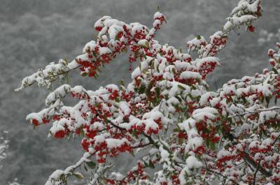 5日夜晚开始,神农架林区海拔1500米以上的地方,迎来了2014年第一场雪,积雪厚度达5cm,山上都被积雪覆盖,一派银装素裹的冰雪世界。 图为神农架自然展览馆前被白雪与红色火棘果红白相映美轮美奂。