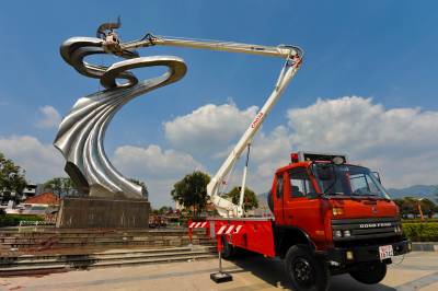 3月27日,工人们在举高车上清洗巴东巫峡广场新雕塑。 随着城市功能的不断完善,原巫峡广场配套设施已越来越不适应市民休闲娱乐和城市发展的需要,该县决定对其改造。据该县建设局有关负责人介绍,巫峡广场新雕塑被命名为《腾飞》,分上、中、下三大主题结构,造型整体呈火炬状,赋予城市现代气息,取巴东”三山两江”和县城”三江六岸”总体规划设计的抽象寓意,象征万众一心的巴东人民团结向前奔向无限美好的未来,是广场新改造项目和城市标志性建筑之一,总投资30多万元。为避免重复投资,原《马踏飞燕》雕塑将被移放到长江大桥南岸纤夫旅游广场。