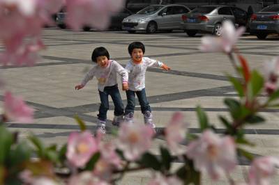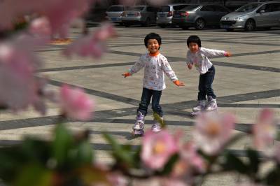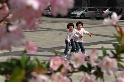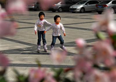 2010年3月28日,武汉大学,一对来自武昌的五岁双胞胎姐妹在樱花树下玩轮滑,享受运动的快乐。武汉大学樱花节举办以来,已经成为武汉春天的一处著名景点,越来越受到全国游客的关注。