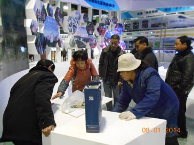 1月8日,几名工作人员正在硒博会恩施特色馆布馆现场忙碌。 恩施馆整体以“大花轿”为原型,突出恩施女儿会、恩施玉露、恩施大峡谷三张名片。(本报视界网 温锋 摄)