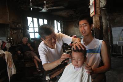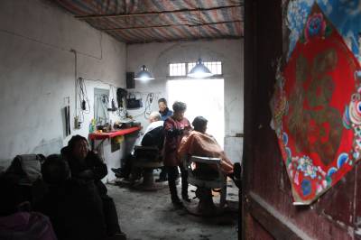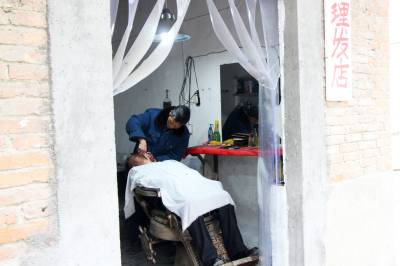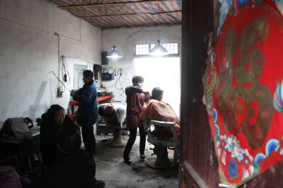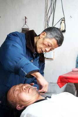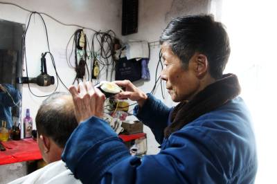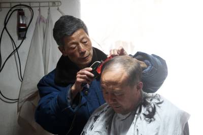 1月9日,王永华在新近开业的理发店为顾客理发。71岁的王永华与80岁王德恒、75岁的哈成超、70岁的柯贵生、53岁的王衍菊一直在竹溪县西关街老理发店理发(西关理发店创建于1943年,创始人杨建发1975年去世)。去年五月,竹溪正式对西关片区进行保护性开发,老理发店面临拆迁,10月22日,王永华与同伴们拿到误工补贴搬离老理发店,只等两年后新建成的房子返还后再继续营业,本可以过上清闲的日子,但闲不住的王永华与王衍菊最近又寻觅一处门面开张营业,再次创业,因童叟无欺、价格实惠,顾客盈门。