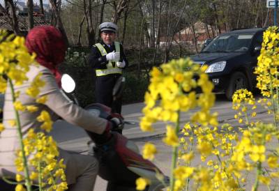 3月29日是,一位交警在乡村公路上执勤,教育村民安全出行。随着农村汽车的增多,往日平静的乡村小路上交通也繁忙起来。为了保证乡村公路的畅通,防止交通事故的发生,湖北省荆门交警支队动员县市一线民警下到田间地头,为农村交通保驾护航。本报视界网陈旭摄
