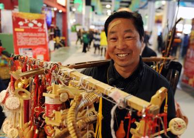 1月10日,恩施市一商贩正在乐呵呵地卖木质玩具。 当前,不少人为了生计,挑着各种货担走街串巷。商贩们说,只要每天能卖出些东西,多赚点钱,这也是一个快乐的事业。本报视野网 王波 摄