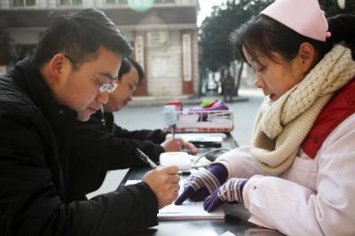 1月13日,竹溪县纪检干部在填写献血者健康情况征询表。竹溪县积极履行“八项规定”, 春节临近,全县干部积极参与无偿献血活动,为“血液银行”存储大量血液,以献爱心的方式,为过一个快乐、廉洁的春节做准备。