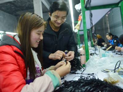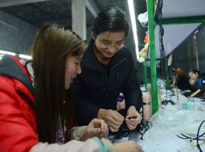 1月14日,在建始县科之信工贸公司生产车间,夏长雄指导工人生产耳机成品技术。该县红岩寺镇秋桂村打工仔夏长雄,去年,在深圳电子厂拼打10余年学技后返村,在镇村鼓励支持下,投资数百万元在村里创办起了电子加工厂,专门从事耳机成品设计、生产和销售,产品东南亚及非洲不少国家,月销售收入突破10万美元,同时还吸纳了村里上百名留守妇女家门口就业。记者刘波本报视界网卢晓红摄