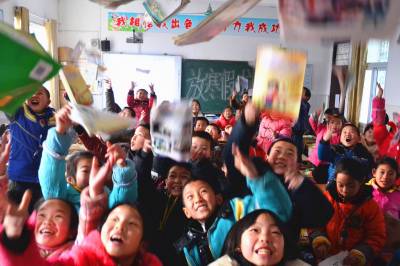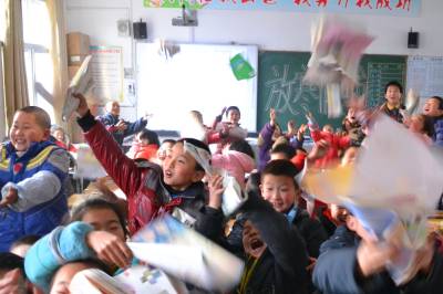1月15日,参加完期末考试的湖北省郧县柳陂镇中心小学四(1)班的学生们,兴奋地向空中抛扔课本,开始拥抱属于自己的寒假。