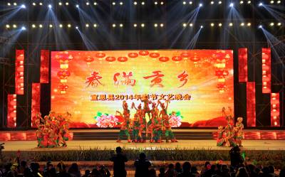 节俭办春晚 欢乐迎马年 1月15日,演员们在宣恩县2014年春节联欢晚会上表演节目。当天,该县按照节俭办晚会的要求,以“拼盘办晚会”的形式组织各乡镇、县直机关及社会团体在人民广场自编自演了一批丰富多彩、喜闻乐见、具有地方特色的文艺节目,让全县人民尽享“文化之美”,喜迎马年到来。 视界网 李以国摄 (13997771030)
