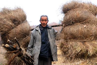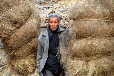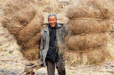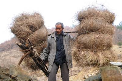 1月16日,郧县青曲镇红光村3组74岁的老汉周国有正挑着100多斤的龙须草下山回家,据周国有老大爷介绍,入冬没的什么事时就上山割龙顺草,每天割200多斤,一冬至少割5000多斤,按每100斤55元钱,一冬也能挣3000多元钱。 夲报视界网周家山 摄