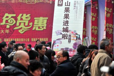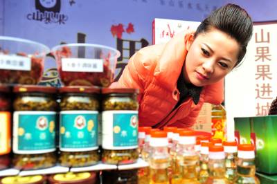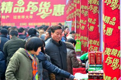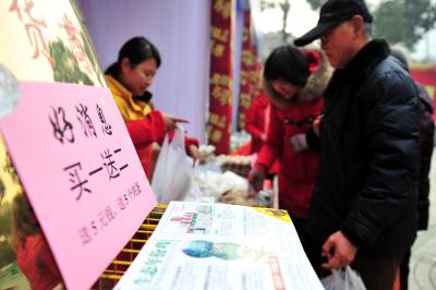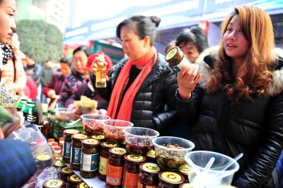 2013年1月19日,随着2014年春节临近,宜昌市夷陵区搭建为期一周时间的“新春精品年货惠”名优土特产品展销平台,当地26家农产品企业及农业专业合作社一起“抱团”进城吆喝叫卖,现场共展出有机、绿色、无公害认证的果品、蔬菜、粮食等农副产品种类150多个,这些农产品采取免费派送或让利销售的方式,让城里市民在家门口尽享土色土香的年货盛宴,喜迎新春佳节到来。 本报视界网 张国荣 摄