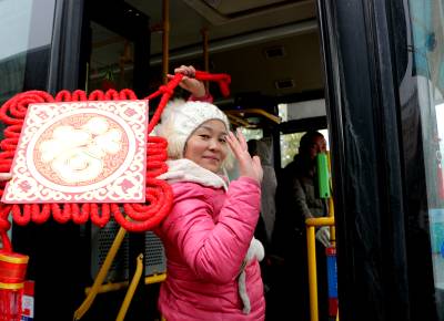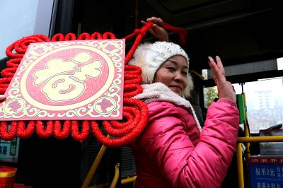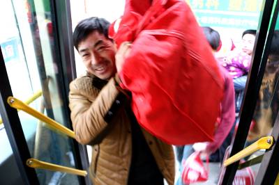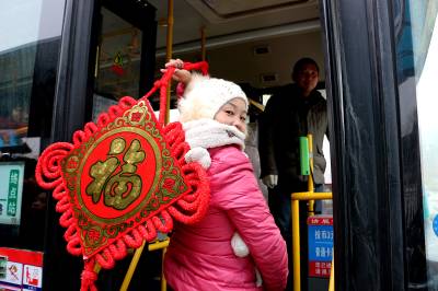 1月19日,一位返乡女乘客手持镶嵌福字的大红中国结登车,用这特殊礼物表达对“春运”的祝福和家人的新春问候。当日,郧县迎来外出务工人员返乡小高潮,启动客运车300多辆加班加点输送。接待乘客达万人次。 本报视界网 曹相聪