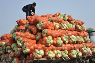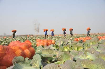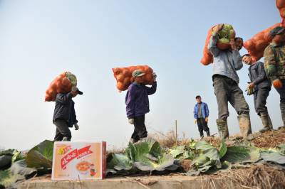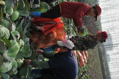 元月19日,嘉鱼县牌州湾镇卷心包菜喜获丰收。连日来,这里运菜车辆不断,成千上万吨的卷心包菜源源不断销往北京、河北、广东等地。图为菜农在园中摘菜装车。