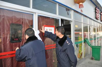 沪蓉高速公路湖北省利川段某服务区内开设超市,无食品流通许可证、无营业执照从事食品经营引发消费纠纷,于1月21日被投诉,湖北省利川市工商局1月22日依法查封该超市。图为执法人员现场查封该超市。(图/文 李鹏程)