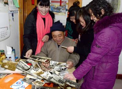 黄石市西塞山区黄思湾社区计生干部正在空巢老人张维金家看他的老照片。