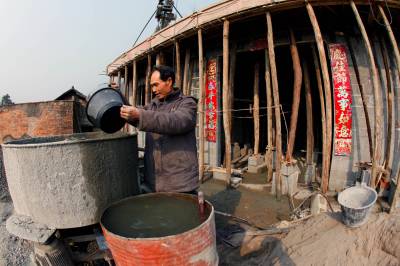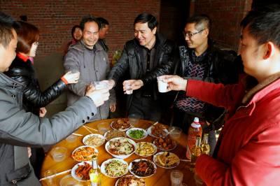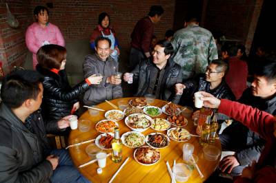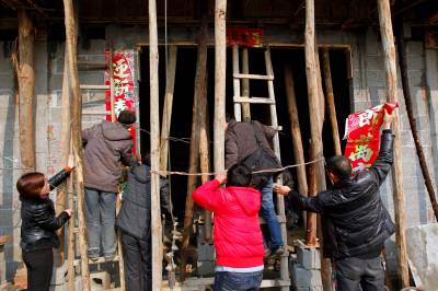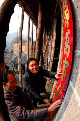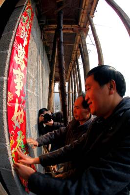 1月25日,在巴东县官渡口镇大坪村一组,镇党委书记谭文通(左二)正与地震灾民向仕树(左一)一起贴新春对联。