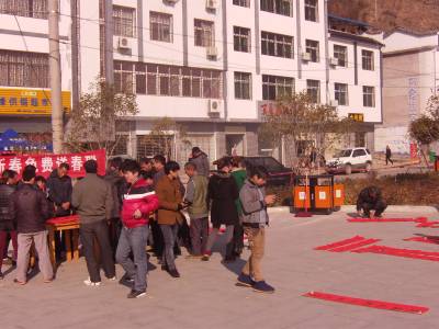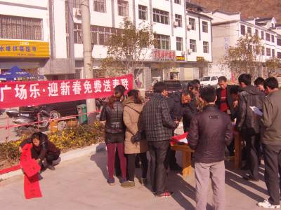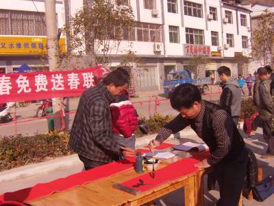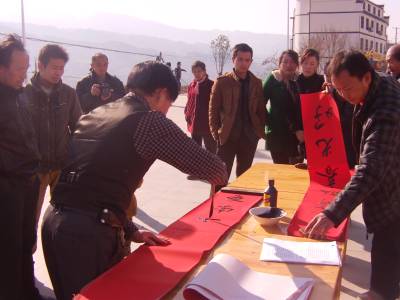 元月23日上午,在罗田县白庙河乡跨马广场上,来自罗田县书法家协会的四位书法家现场献艺,提笔挥毫为山区农民送上一幅幅龙飞凤舞的春联,赢得观众一声声赞美和热情的掌声。 视界网 刘放鸣摄影