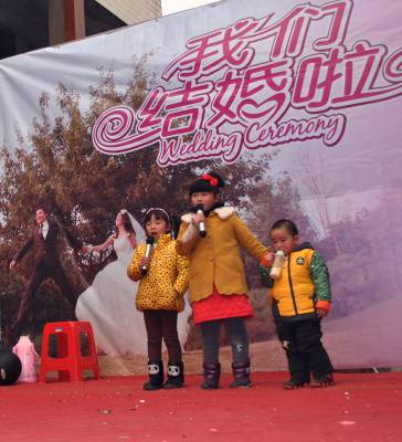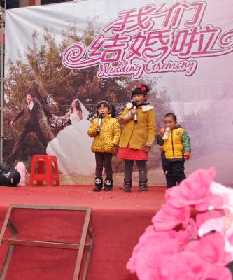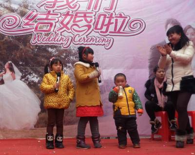 每年春节,大量的务工返乡适婚青年举行婚礼。潜江市的杨华与湖南妹子王虹于元月28日结婚,仪式结束后,俩名小女孩自动上台唱起了时尚动感的流行歌曲,另有一名两岁男童口含奶瓶,摆动有节奏的舞步,惹得全场嘉宾开怀大笑。