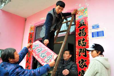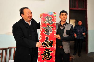 2014年1月28日,湖北省宜昌市启动各级领导干部春节期间“结亲拜年”活动。夷陵区委书记刘洪福来到龙泉镇香烟寺村村民罗金瑞家中,送去一幅春联,让全家人心里暖呼呼的。