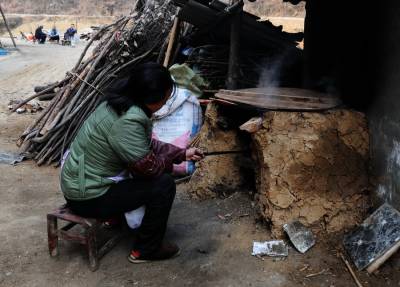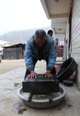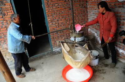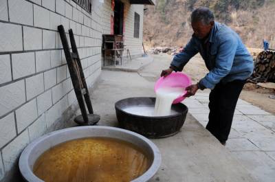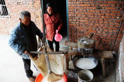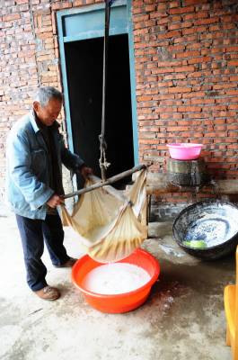 在郧县柳陂镇史家院村,我们来到了66岁的村民芦冬兵家摄影小磨豆腐的加工过程。一大早芦冬兵老俩囗将泡的的黄豆用小石磨推磨起来,被磨出的白色豆汁顺磨盘流出,磨完豆子后老俩囗又配合过包,过包后的豆汁被倒进临时砌筑的大锅里烧开,烧开后成为豆浆,豆浆被转入大盆为后拌入少许石膏,等20分钟后成为豆腐脑后,将豆腐脑倒进方型木板模具內将布包包好,上面放入一块方木板盖上,木板盖上放上一桶内装50斤水的水桶圧在上面将豆腐脑内多余的水圧出,两小时后的形成一大方块重25斤重的小磨豆腐。