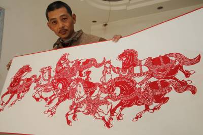 马年春节临近,襄阳民间艺人胡建强创作了大量以“马”为主题的剪纸作品。昨日,他向记者展示耗时半个月创作出来的作品——《骏马奔腾》。