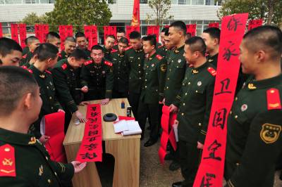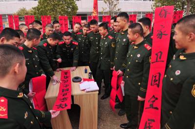 “荆楚大地龙腾马跃迎新春,忠诚卫士紧握钢枪守江城”、“无私奉献显将士风采,群马奔腾辞旧迎新春”,一幅幅气势磅礴的春联在大红纸上一气呵成,武警湖北总队一支队机关顿时变得红火起来。战士们自己撰联、自己书写,将一幅幅春联悬挂在营区,营造出浓厚的节日氛围。 谢定安、梁俊平 摄