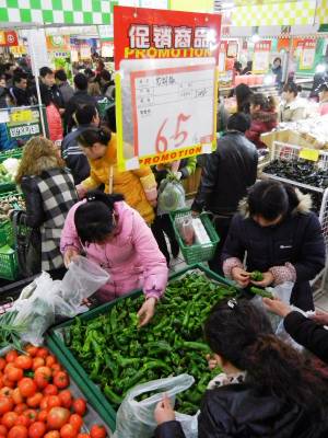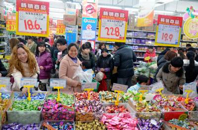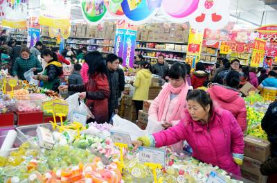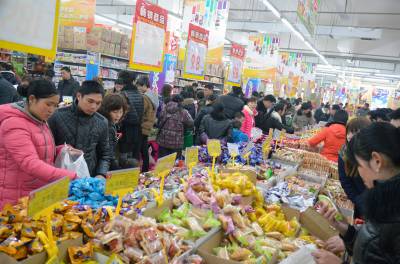 28日,云梦县城关建设路一大型超市人气旺盛,节日氛围浓厚,城乡居民踊跃购买年货,商家纷纷举行促销活动抢抓商机,消费品市场购销两旺,一派繁荣景象。 王云清 摄