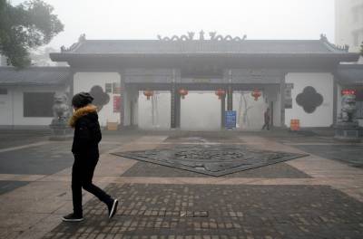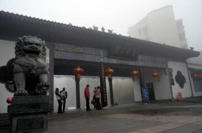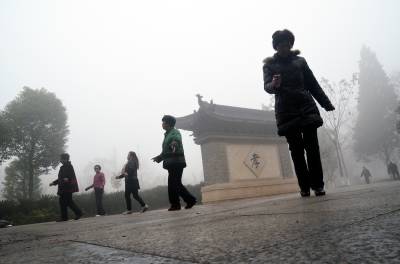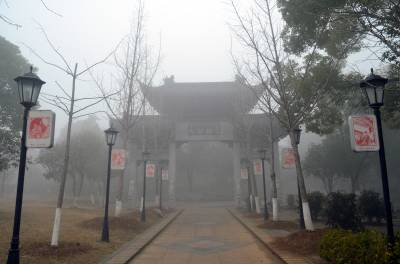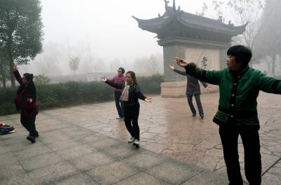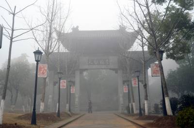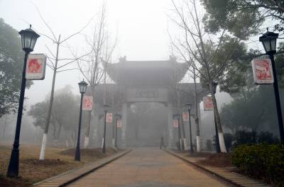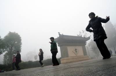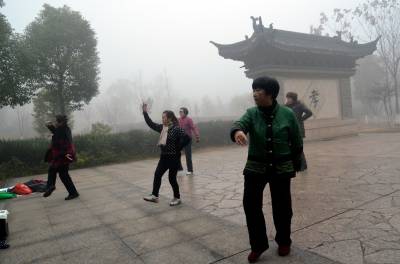 1月30日,孝感市董永公园被笼罩在浓浓的雾霾里,宛若仙境,几位早锻炼的大妈在“孝”字碑旁跳舞。当日5时40分湖北省气象部门发布了大雾橙色预警信号:武汉、孝感、荆门等多地已经出现能见度小于200米,局部小于50米的雾,并将持续。