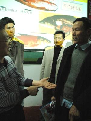 3月30日,云梦县伍洛镇大杨村养殖户丁福涛(右一)正在咨询每立方水体该养多少鱼才能保证鱼的”福利”(即健康)。为了倡导健康养殖理念,促进水产养殖与环境科学、协调发展,当日,云梦县水产局对全县70多个渔业养殖大户进行健康养殖培训,特邀有关专家讲授了无公害养殖技术、淡水养殖用水的水质要求和禁用药物等知识。(本报视界网王云清摄)作者通联:云梦县工商局王云清邮编:432500电话:13972657005