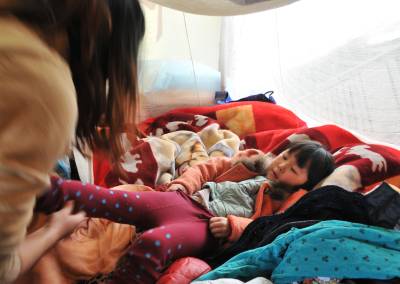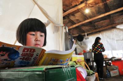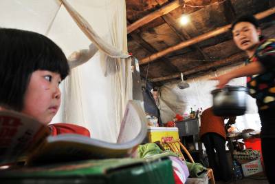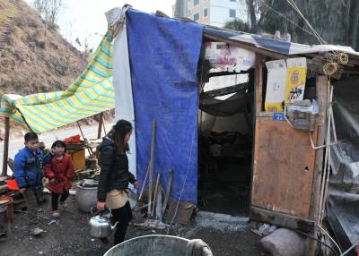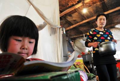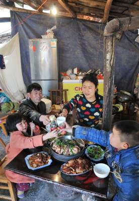 曾维军、冯禹是巴东县官渡口镇五里堆社区一组农民。去年巴东发生5.1级地震,导致他们家的房屋成了D 级危房。该镇迅速为他们搭建了帐篷,安排房屋拆迁和重建资金。快过年了,联系他们的政府干部田丛云三番五次登门拜访,送去慰问金和过年物资,鼓励他们重建美好家园。预计今年5月可以入住新居。(本报视界网 梁勇 梁斌 摄)