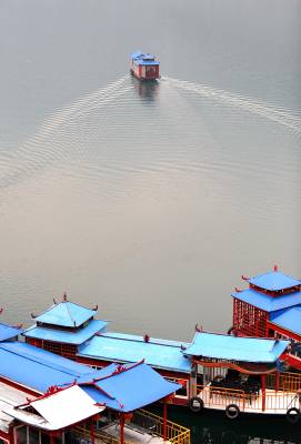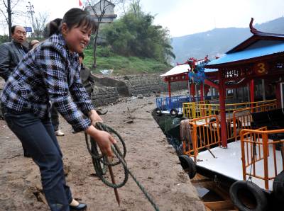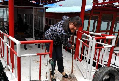 3月30日,宣恩县珠山镇双龙湖库区一农家女在旅客返回后清理船舱。随着恩施州高速公路、铁路相继开通,一度因交通信息闭塞而对旅游业基本没有什么概念的山区农民也开始涉足旅游业,并积极为融入”鄂西生态文化旅游圈”摩拳擦掌。(视界网签约摄影师:宋文摄)