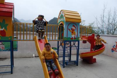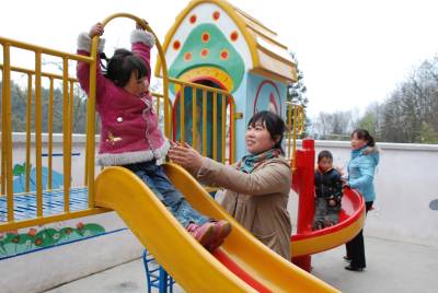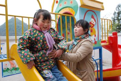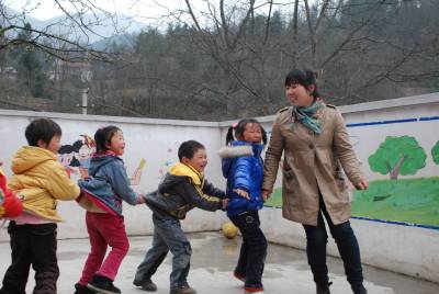 3月30日,五峰土家族自治县牛庄乡牛庄村幼儿园教师陆云丽在和孩子们一起做游戏。海拔1400多米的牛庄村,是该县最边远的村庄之一。为发家致富,该村不少青年夫妇撇下孩子外出打工,不少孩子成为留守儿童。该村女青年陆云丽师范毕业后,投资建起了幼儿园,成为留守儿童的健康成长的乐园。(本报通讯员肖永奎)